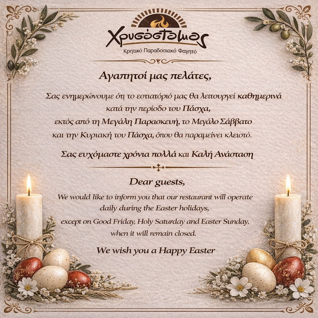 Γνήσιες Κρητικές γεύσεις μαγειρεμένες στο ξυλόφουρνο που φτιάχνονται με όρεξη, μεράκι και αυθεντικά ποιοτικά κρητικά υλικά κυρίως παρμένα από την γη των Σφακίων είναι η φιλοσοφία του εστιατορίου μας.